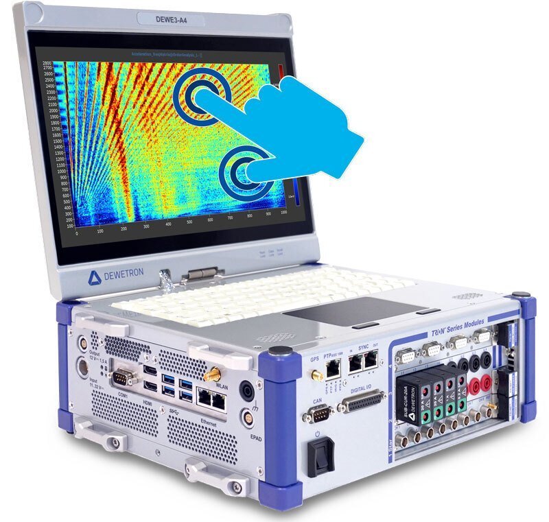 DEWE3-A4配備了一個明亮的13.3”寬屏多點觸控全高清顯示屏來控制系統(tǒng)。你可以用手指觸屏操作,就像在智能手機上一樣。例如,從屏幕右側(cè)拖動側(cè)邊欄打開頻道設置。此外,DAQ數(shù)采系統(tǒng)可以通過2個指定鍵的多點觸摸觸摸板進行控制。按觸控板也會觸發(fā)按鍵。